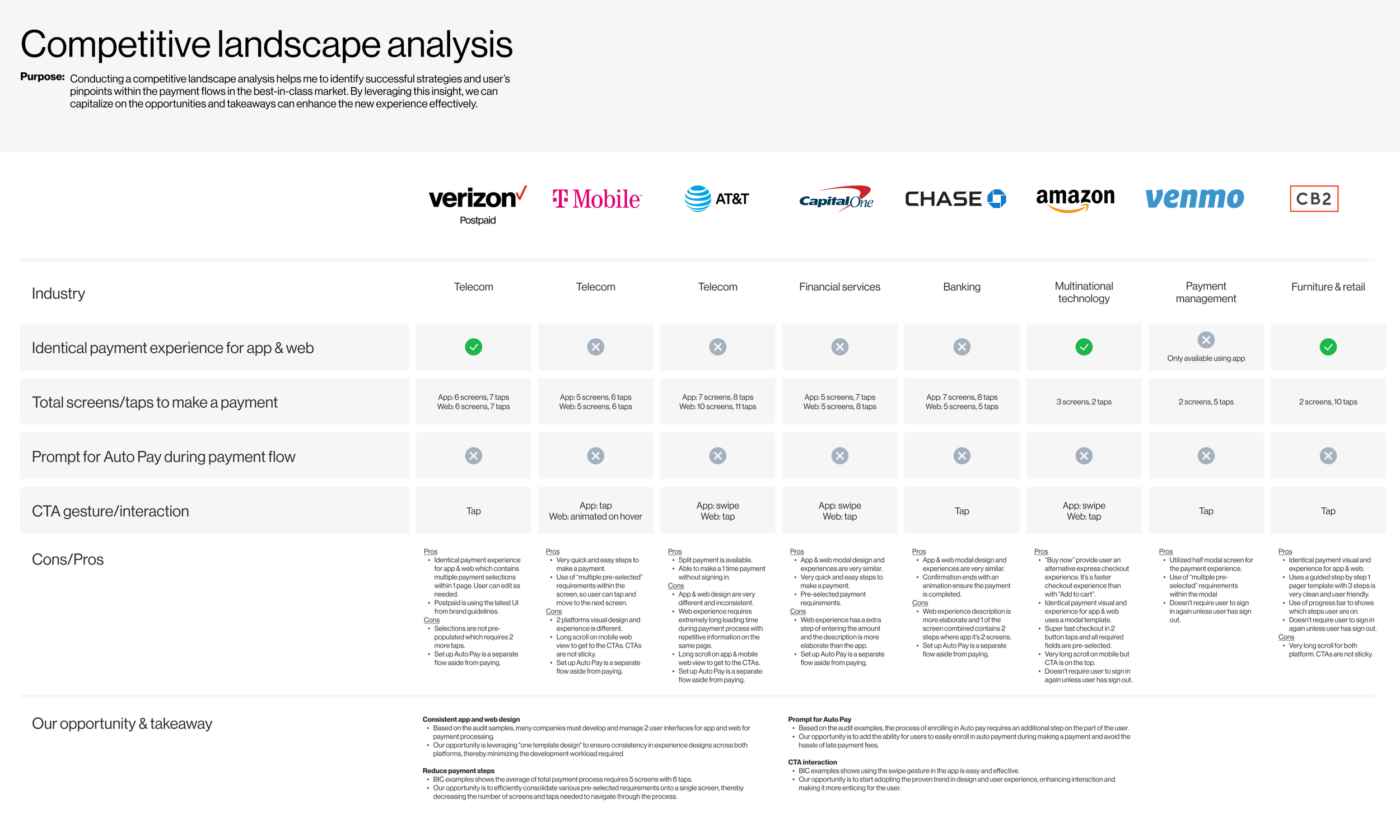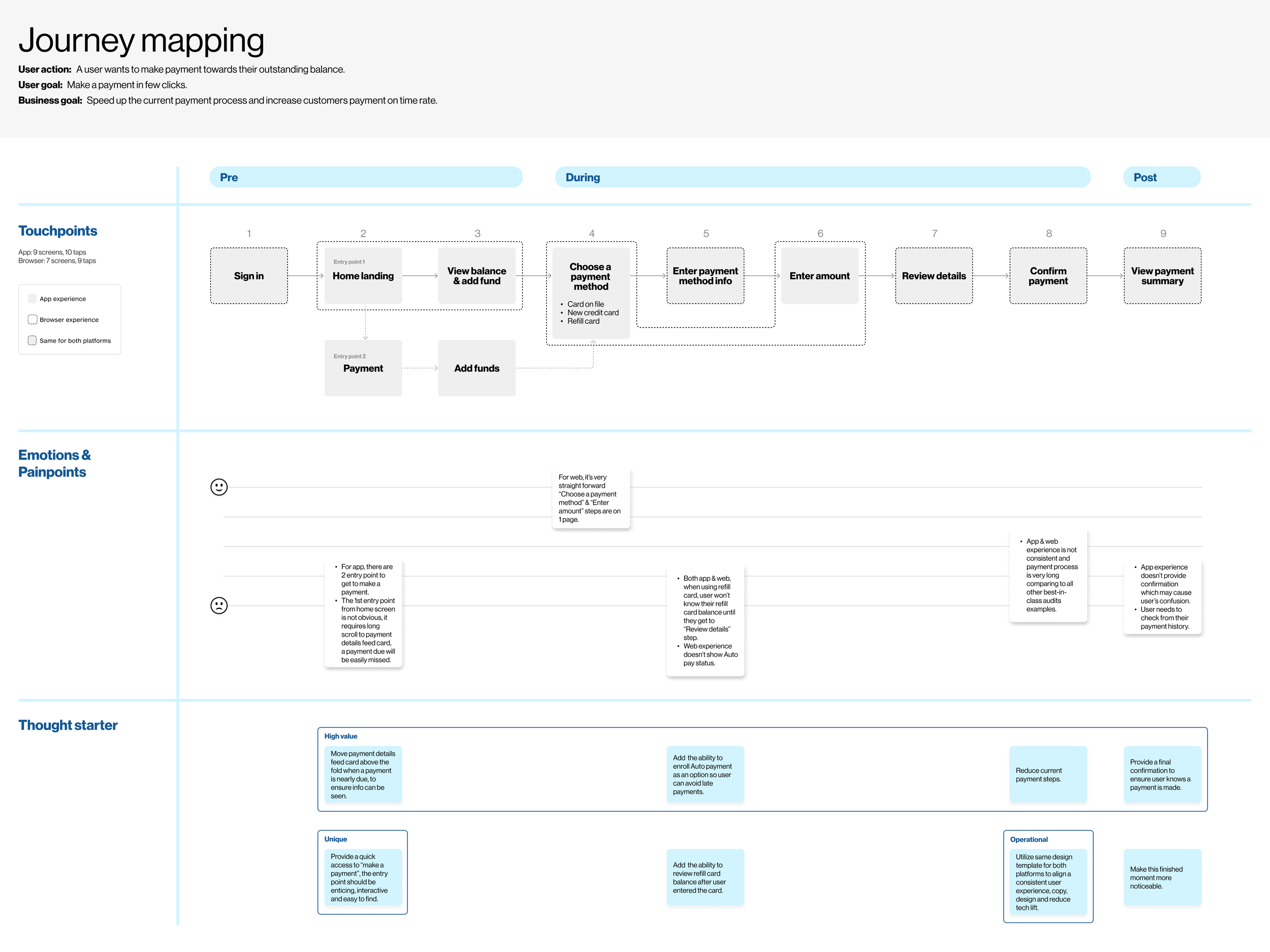 As the project's UX lead, my responsibilities include understanding our main target audience, conducting competitive & landscape analysis to understand and compare with the market trend, evaluating the existing payment process across app & web browser platforms by creating user journeys before beginning the ideation process.