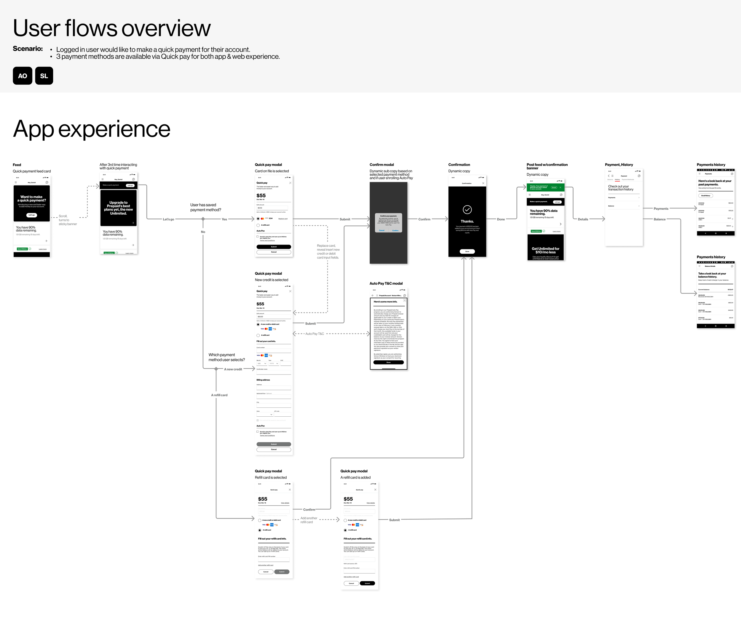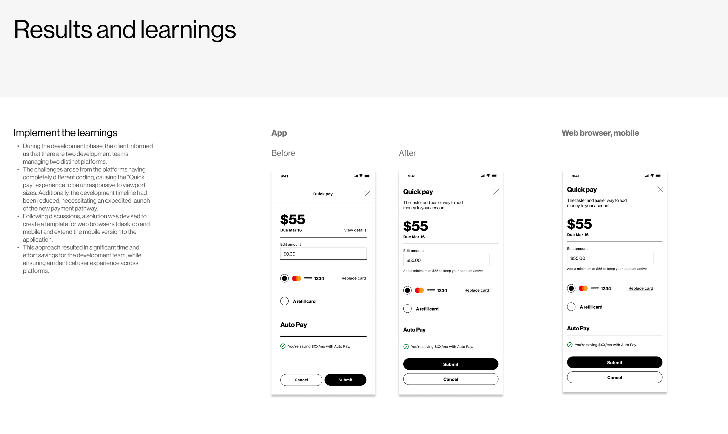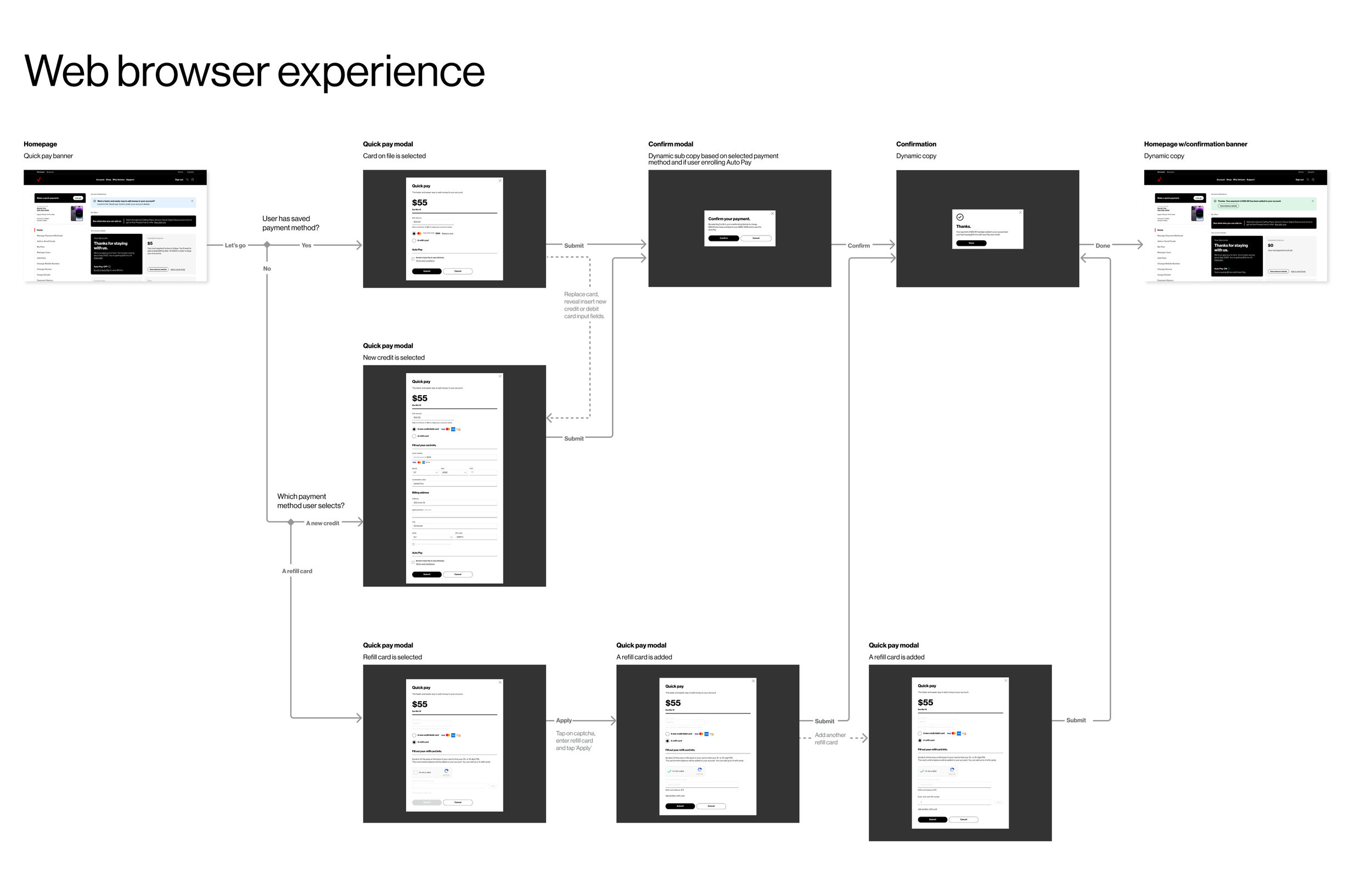 The final design of the app and browser payment paths shines in how it seamlessly connects the user to an end-to-end payment process that spans effortlessly across both platforms. Every detail has been carefully considered to ensure a smooth and intuitive payment experience for all users. It is a collective effort that involves closely collaborating with the AKQA creative team and the Verizon stakeholders, ensuring effective communication and alignment throughout the project.
