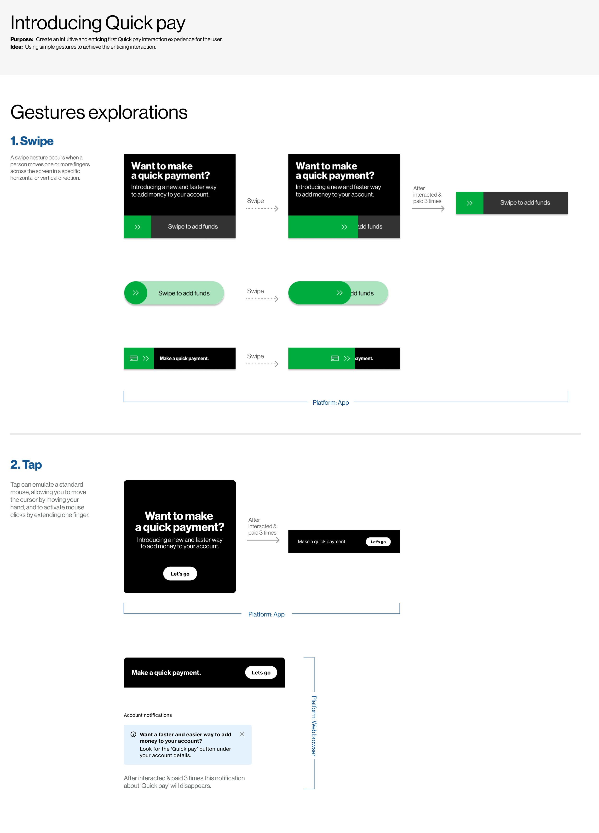 With the competitor and best-in-class in mind, we carefully considered and experimented with the gestures of swipe versus taps to seamlessly integrate this interaction into our design. After assessing the level of effort and feasibility of development, we ultimately decided to go with the “tap” interaction for both the app and web browser experience.